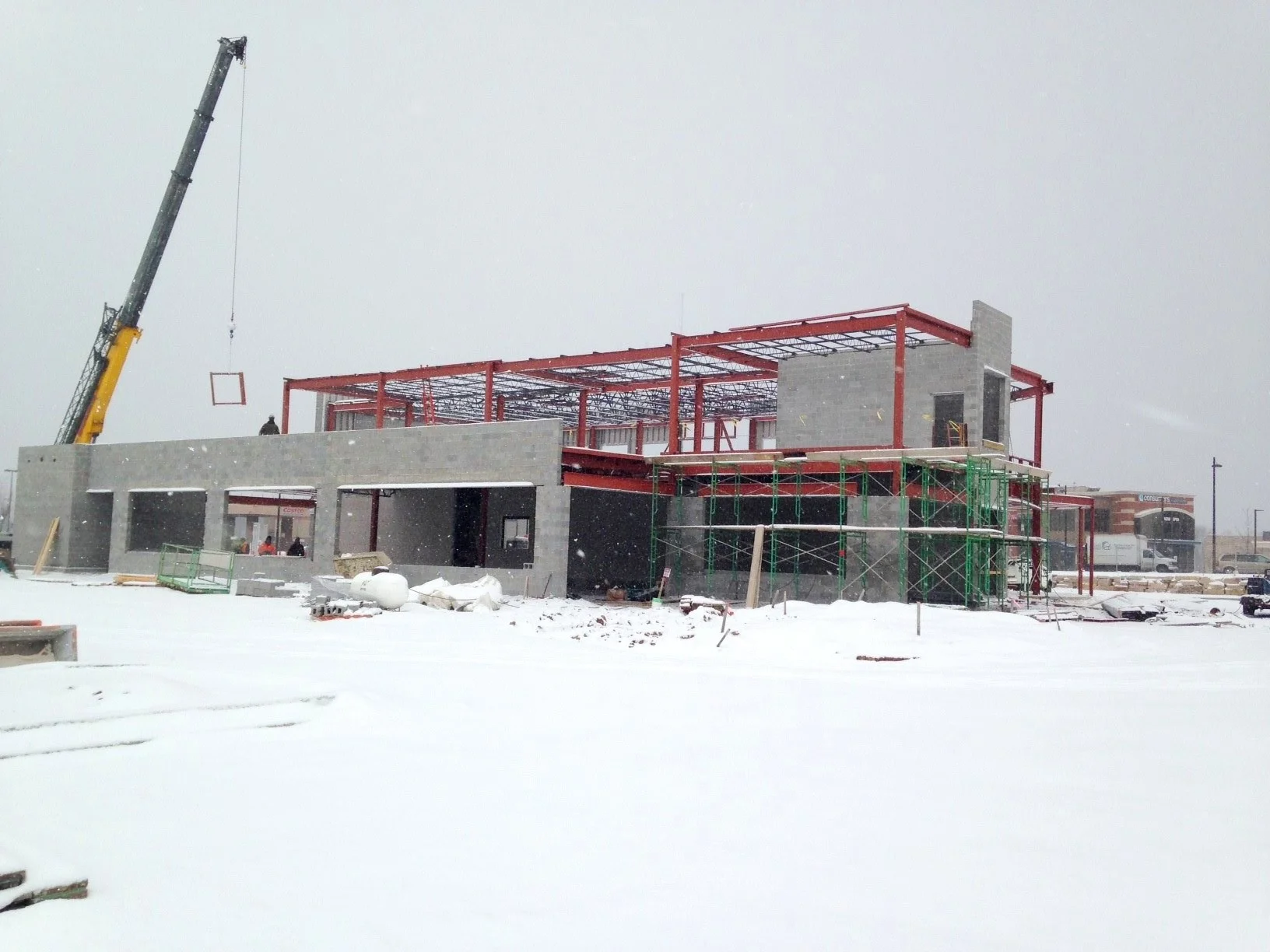 The steel frame and cinder block walls are up at Old National Bank’s new regional headquarters and banking center on the corner of Century Avenue and Drake Road within Corner@Drake. This new regional office will be a great landmark and serve as a prominent gateway to the Kalamazoo community. The two story brick and stone building will feature 15,000 square feet of customer banking, loan offices and corporate regional offices. Old National Bank has a scheduled completion date for summer of 2017.